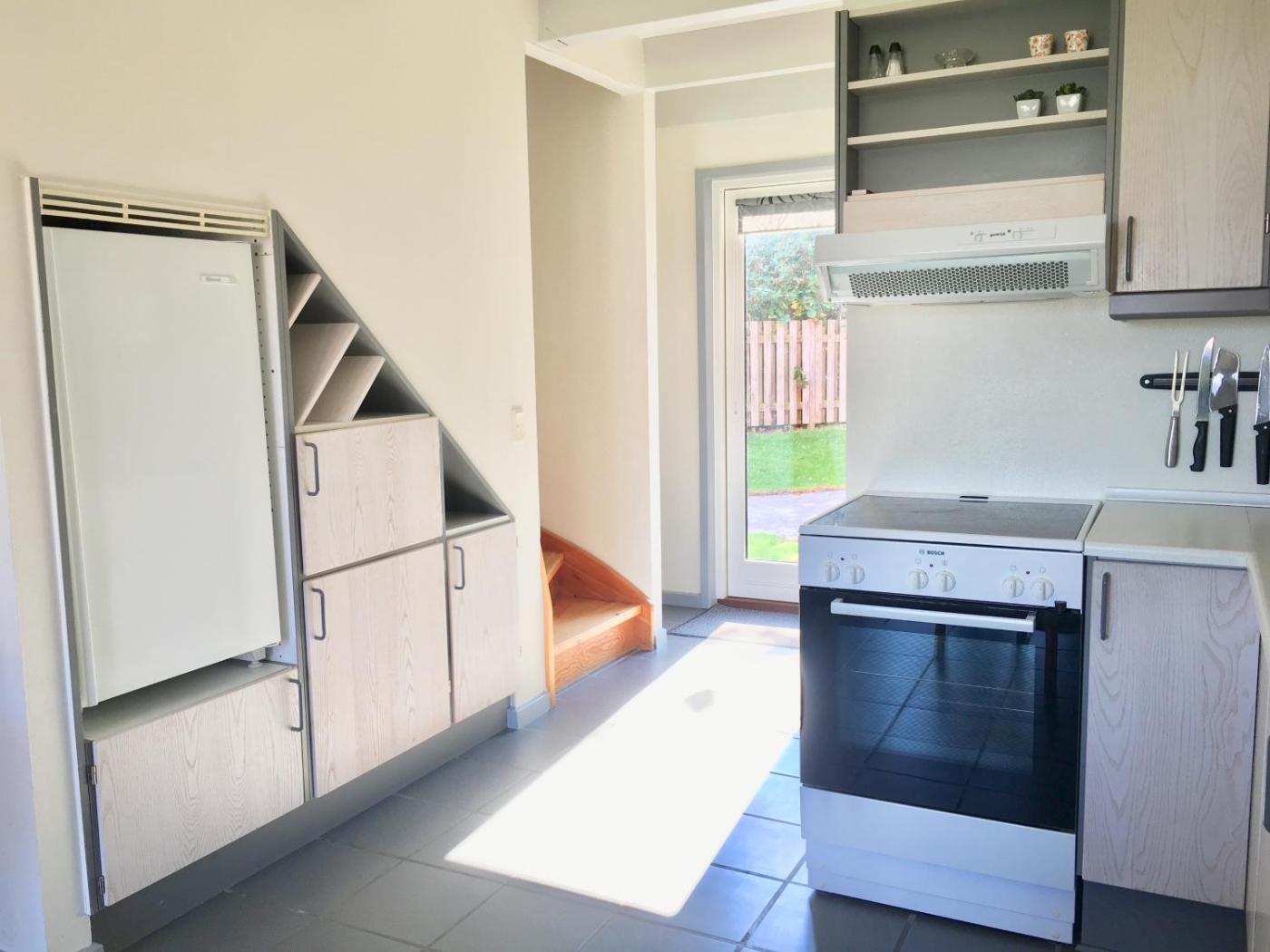 A seating area and a flat-screen TV feature in the living rooms at Øster Hurup Feriecenter’s holiday houses. Kitchen facilities include a stove, fridge and dishwasher.